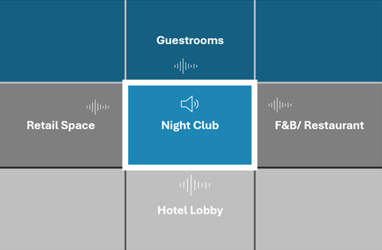 As you can see, the nightclub is surrounded by noise-sensitive space all around. Therefore, the containment of noise within the space is of utmost importance. If the AV team has coordinated with the Acoustic team, then the Acoustic team can propose the following few noise mitigation solutions for effective noise containment