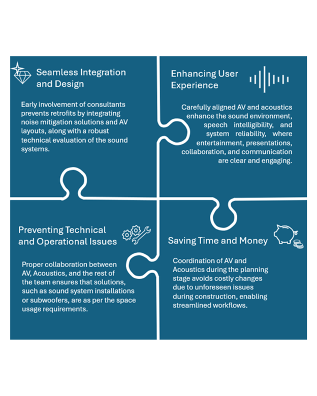 When AV and acoustics are well aligned, users enjoy clear, reliable sound that enhances entertainment, presentations, and collaboration without issues like echo or feedback.