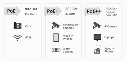 IEEE 802.3at (PoE+) | 2009 | 30W | 25.5W | 2 pairs | PTZ CCTV, Wi-Fi |